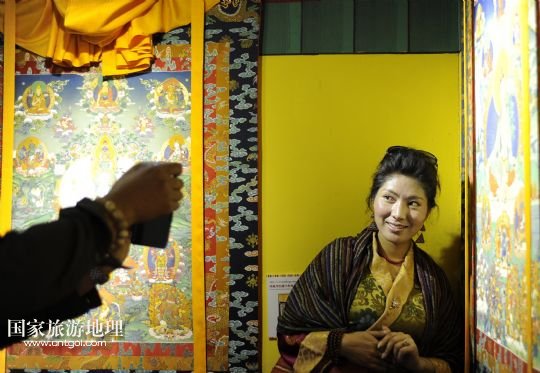 8月3日,一名藏族姑娘在唐卡前留影。