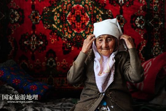 今年已經(jīng)90歲,同時也是馬海村年齡最大的村民哈麗麥在整理頭巾(8月11日攝)。