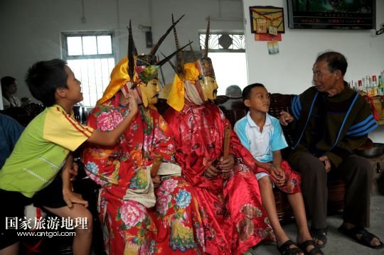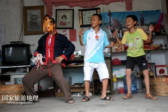 國家旅游地理 廣西河池8月19日訊 8月18日,譚圣慈老人(左一)帶著前來學習的兩名男孩跳儺面舞。在廣西北部與貴州交界一帶的我國唯一的毛南族自治縣——環(huán)江毛南族自治縣,神秘的儺戲被譽為毛南族的“族寶”。原始古樸、風格獨特的儺戲是毛南族的民間傳統(tǒng)舞蹈,藝人在表演過程中經(jīng)常戴著被稱為儺面的木制面具。儺面一般高30厘米、寬20厘米,由毛南族藝人在民族口頭文學的基礎上依據(jù)個人想象創(chuàng)作,用優(yōu)質(zhì)木塊雕琢而成,共有文、武、善、兇四大類72種面相。