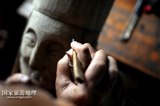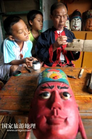 譚圣慈老人今年72歲,從22歲開始學雕刻儺戲面具,迄今,已經(jīng)堅持了50年。老人說,他制作的面具因工藝精湛,造型優(yōu)美,曾吸引遠方的客人高價購買。但是,卻少有人來學習面具的雕刻與制作。儺戲于2006年被列入非物質(zhì)文化遺產(chǎn)名錄之后,政府加大了保護力度,但因為面具的制作周期長、工序復雜,銷售渠道少等原因,仍無法吸引年輕人學習雕刻的興趣。為了收到心儀的徒弟,傳承這獨到的技藝,他到處發(fā)布免費收學徒的信息。在他的堅持下,今年暑期,鄉(xiāng)里有兩名對面具制作感興趣的男孩來到譚圣慈身邊學藝。老人高興地說:“我給他們講很多故事,就是希望他們能對此提起興趣,愛上木面雕刻,別讓這老手藝失傳了。” /新華社發(fā)