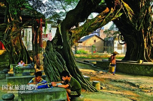 其四,鏡頭也能說故事,圖片里面有人文。呂建偉并沒有把古榕、古建筑當作無生命的標本來拍攝,而是用鏡頭來記錄那方水土中人們的生存環(huán)境、生活內(nèi)容和精神風(fēng)貌,讓平面的圖片凸顯出豐富的、具有特色的人文元素來。從圖片的標題《冬陽遍灑暖人間》、《古榕塘畔好“擺古”》、《憶往昔舊事歷歷味更濃》、《看今朝雛燕展翅欲高飛》中,就能看出作者“以攝影圖片說人文”的理念。