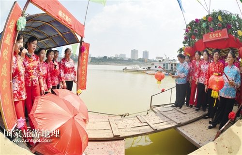 國家旅游地理 廣西南寧10月3日訊(記者 龍博 實習(xí)生 雷麗軍/文 記者 段柳健/圖) 金秋十月的邕江河畔,秋高氣爽,碧水粼粼。昨日,從南寧港的江邊傳來陣陣漁歌與歡喜的嗩吶聲,原來,水上人家周木蘭家在這一天嫁女,一場古樸而傳統(tǒng)的水上婚禮儀式正在邕江岸邊拉開序幕。隨著水上人家的上岸,這樣的傳統(tǒng)婚俗儀式越來越少見,而獨特且略顯神秘的婚俗也吸引了四面八方過來湊熱鬧的人們。