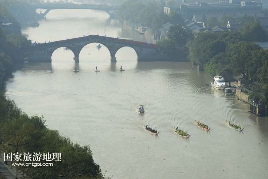 國家旅游地理 浙江杭州11月9日訊 11月9日,參加500米直道競速賽的龍舟隊(duì)從運(yùn)河拱宸橋畔出發(fā)。當(dāng)日,2013年中國龍舟公開賽年度總決賽(杭州站)在京杭大運(yùn)河杭州拱宸橋段舉行。 /新華社發(fā)(李忠 攝)