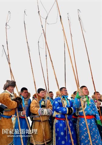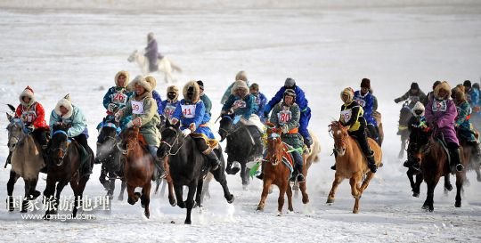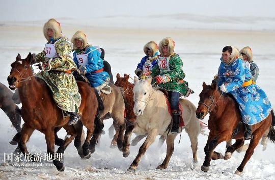 國家旅游地理 內(nèi)蒙古錫林郭勒1月5日訊 1月4日,牧民們?cè)谫愸R比賽中。當(dāng)日,2014年“銀色西烏珠穆沁”杰仁馬文化節(jié)在內(nèi)蒙古錫林郭勒盟西烏珠穆沁旗舉行。當(dāng)?shù)孛晒抛迥撩裆碇A麗的服飾,帶著自家的馬匹,冒著風(fēng)雪嚴(yán)寒,從四面八方趕到會(huì)場,參加了賽馬、套馬、乘馬拾物、蒙古馬選美等多項(xiàng)比賽,吸引了來自全國各地的游客、攝影愛好者以及附近的大批牧民。 /新華社記者任軍川攝
