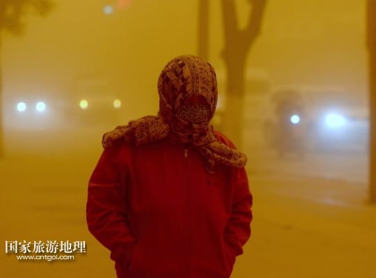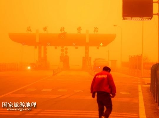 國家旅游地理 甘肅酒泉4月23日訊 4月23日,一輛拉載公路施工人員的三輪車在沙塵暴中行駛在酒泉市瓜州縣城郊的公路上。當(dāng)日,甘肅省酒泉市的敦煌市、瓜州縣等地遭受特強沙塵暴襲擊,最小能見度不足20米。當(dāng)日下午,酒泉市氣象臺發(fā)布沙塵暴紅色預(yù)警信號。 /新華社記者 聶建江 攝