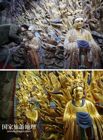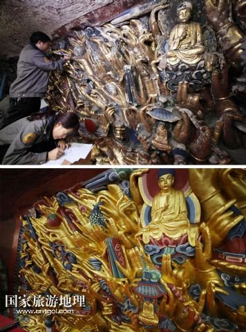 國家旅游地理 重慶6月13日訊 修復(fù)前后的重慶大足千手觀音造像局部(拼版照片,上圖上:2011年2月24日攝,上圖下:2015年3月31日攝)。