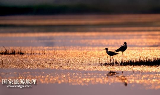 晚霞下,一對鳥兒相約黃昏后(6月17日攝)。在糧倉的西邊,有占地7000余畝的朝邑濕地,這里不僅是鳥的天堂,也吸引了大批游人游覽。